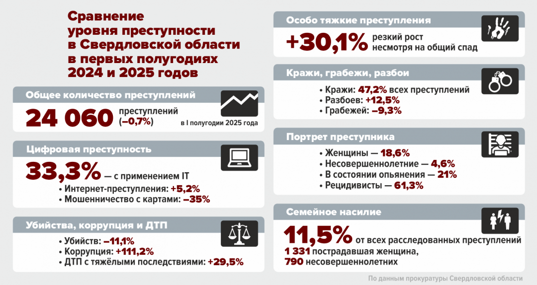Всего на территории Свердловской области было зарегистрировано 24 060 преступлений, что также на 0,7% меньше, чем в минувшем году. Также на 6,5% и на 6,1% сократилось количество преступлений средней тяжести и тяжких соответственно, и, напротив, на 30,1% выросло число особо тяжких преступлений. Количество преступлений небольшой тяжести выросло на 2,8%.