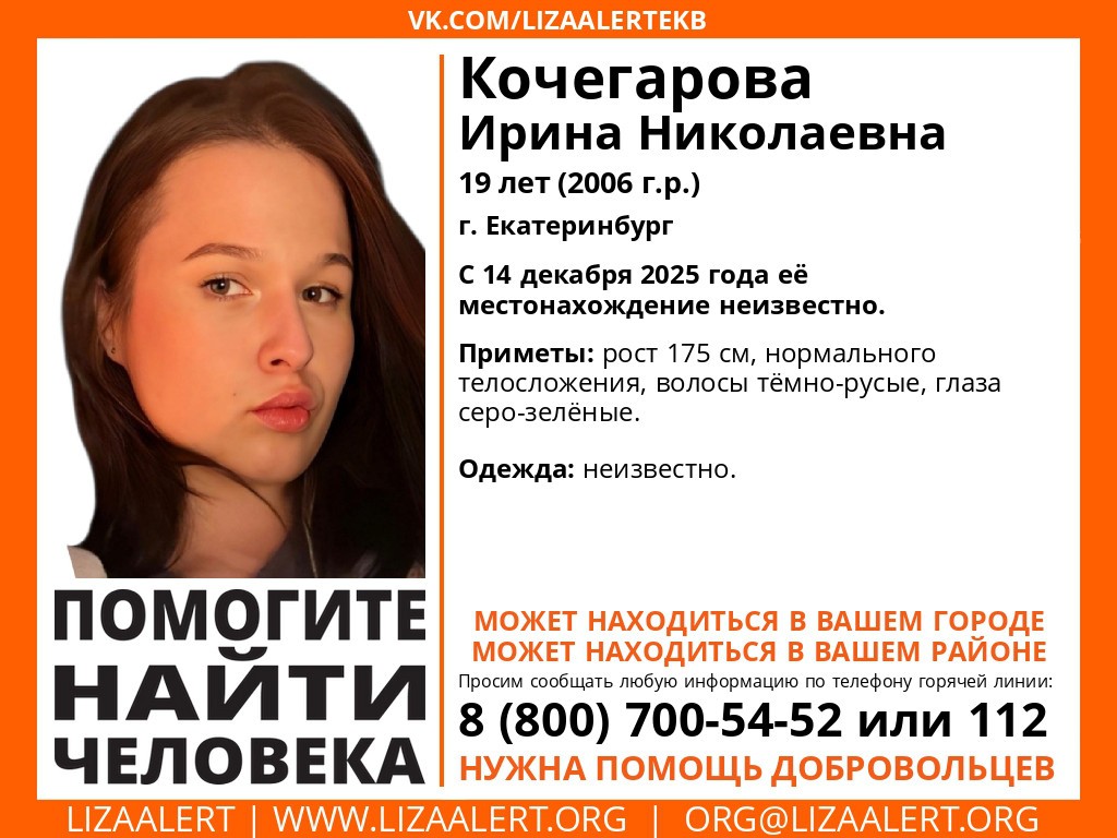 В Екатеринбурге с 14 декабря пропала 19-летняя Ирина Кочегарова. С этого дня её местонахождение остаётся неизвестным, сообщает поисково-спасательный отряд «ЛизаАлерт» Свердловской области.