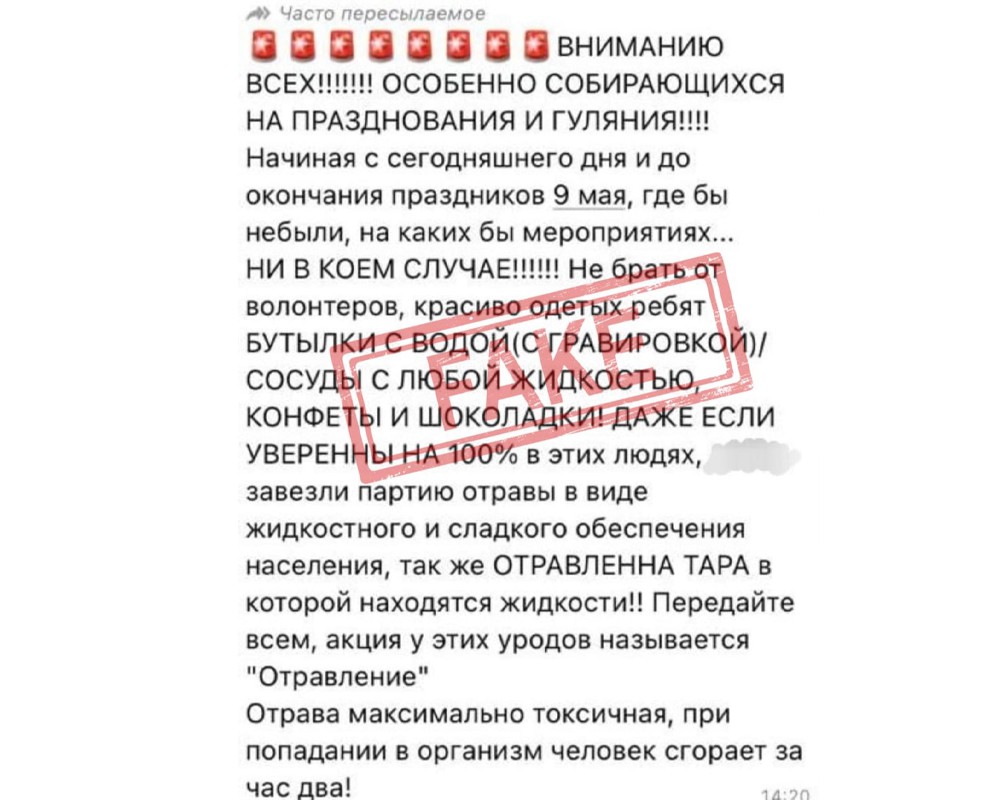 В Екатеринбурге родители начали распространять между собой предупреждение о некой «отраве» в угощениях, которые завтра, 9 мая, якобы хотят выдавать детям. Информация является фейком.