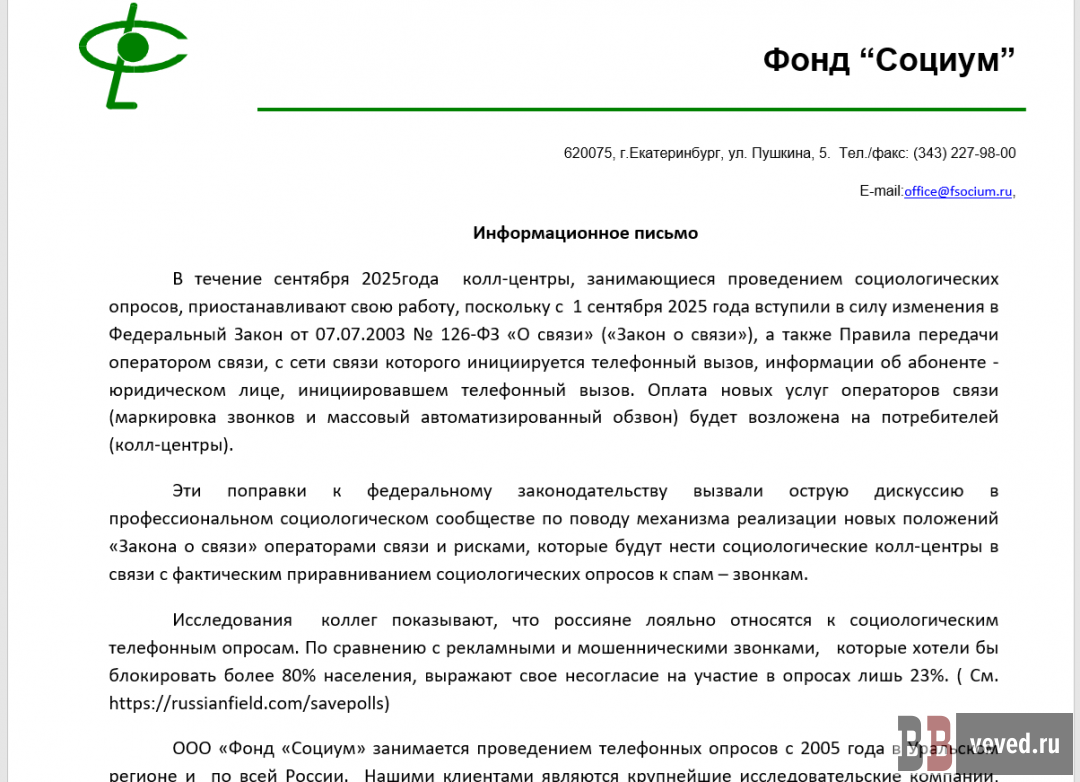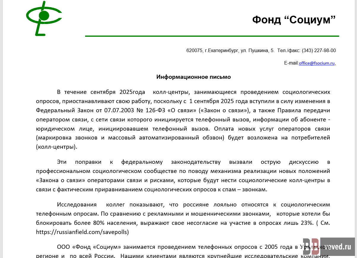 Фрагмент письма от фонда «Социум» (аналогичные письма направили другие исследовательские центры)