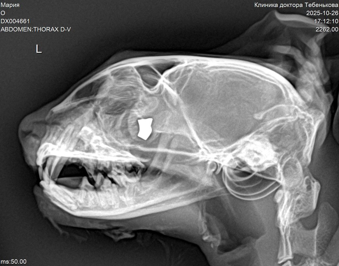 Выстрел какого-то негодяя привёл к серьёзному повреждению — у Марии диагностировали несостоятельности верхнего неба. Но это не единственная проблема. У кошки выявлен ряд серьёзных заболеваний: анемия, гепатобилиарные нарушения, глистная инвазия и блохи. И это выявилось ещё до полной диагностики, которая сейчас невозможно по той же причине, что и хирургическая операция по извлечению пули.