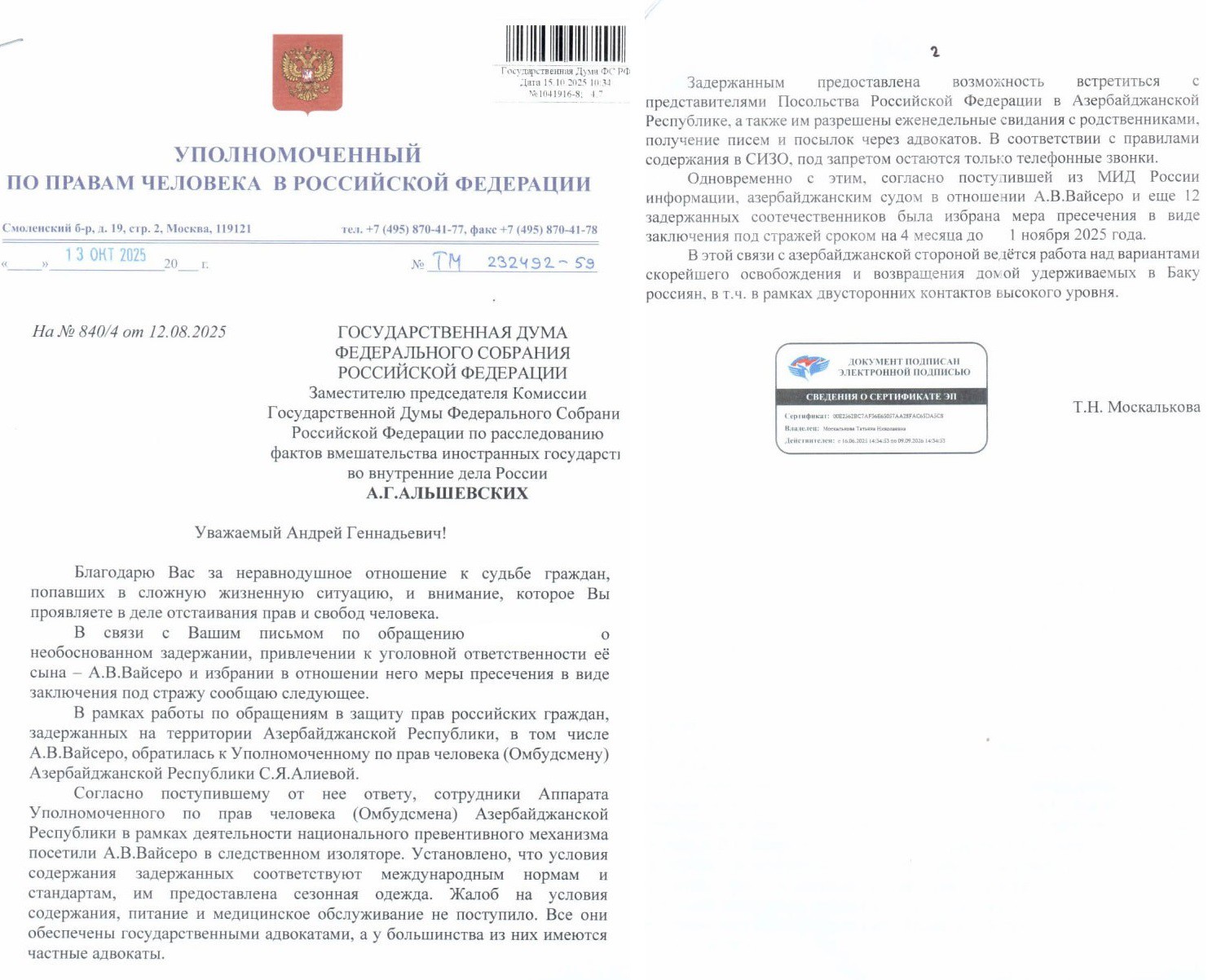 К слову, согласно ответу Москальковой депутату, по состоянию на 13 октября 2025 года в Азербайджане под арестом после задержаний конца июня 2025 года находились 13 россиян, хотя в СМИ фигурировали фамилии только 11 человек (включая Белоусова и Картавых).