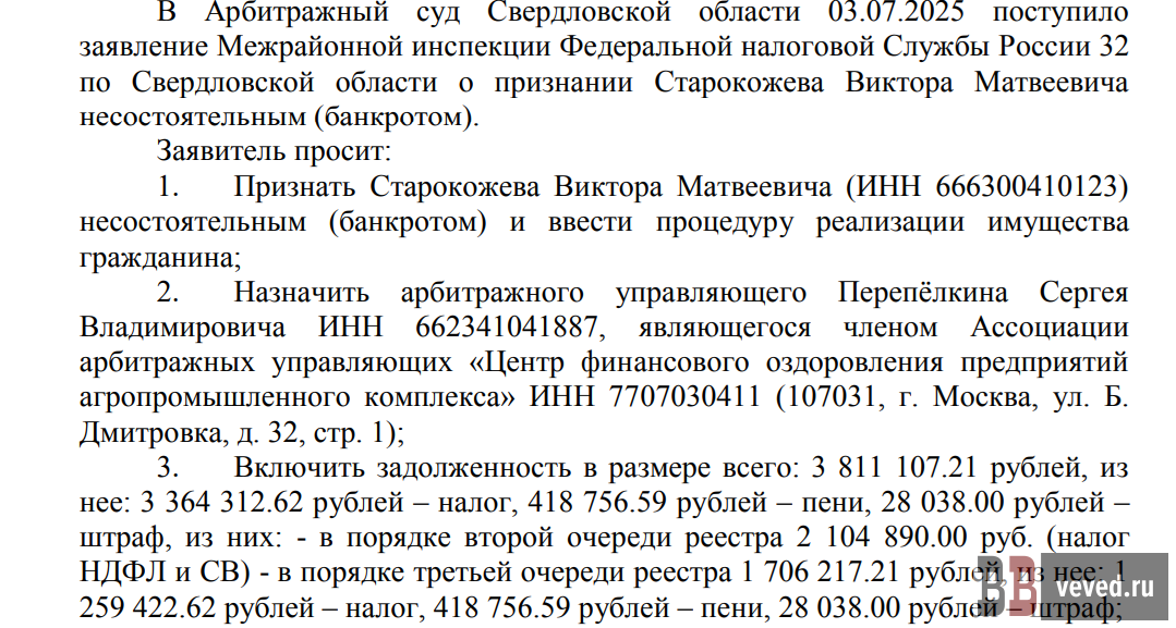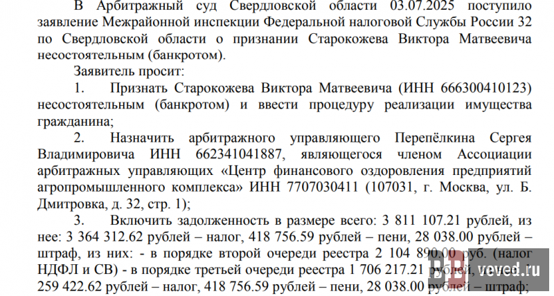 Кроме того, Виктора Старокожева банкротит свердловская ИФНС