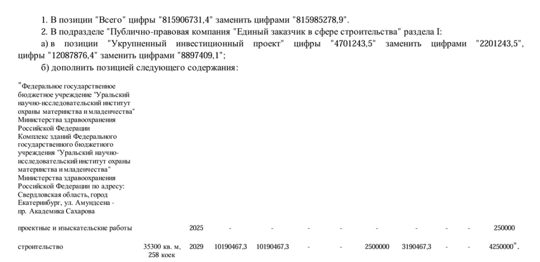 В одном из пунктов распоряжения указан долгожданный проект в Екатеринбурге — Комплекс зданий Федерального государственного бюджетного учреждения «Уральский научно-исследовательский институт охраны материнства и младенчества» Министерства здравоохранения Российской Федерации по адресу: Свердловская область, город Екатеринбург, ул. Амундсена — просп. Академика Сахарова.