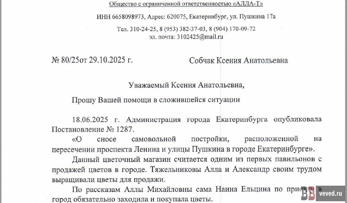 В письме Собчак Лушников указывает на то, что цветы в этом магазине покупала Наина Ельцина.