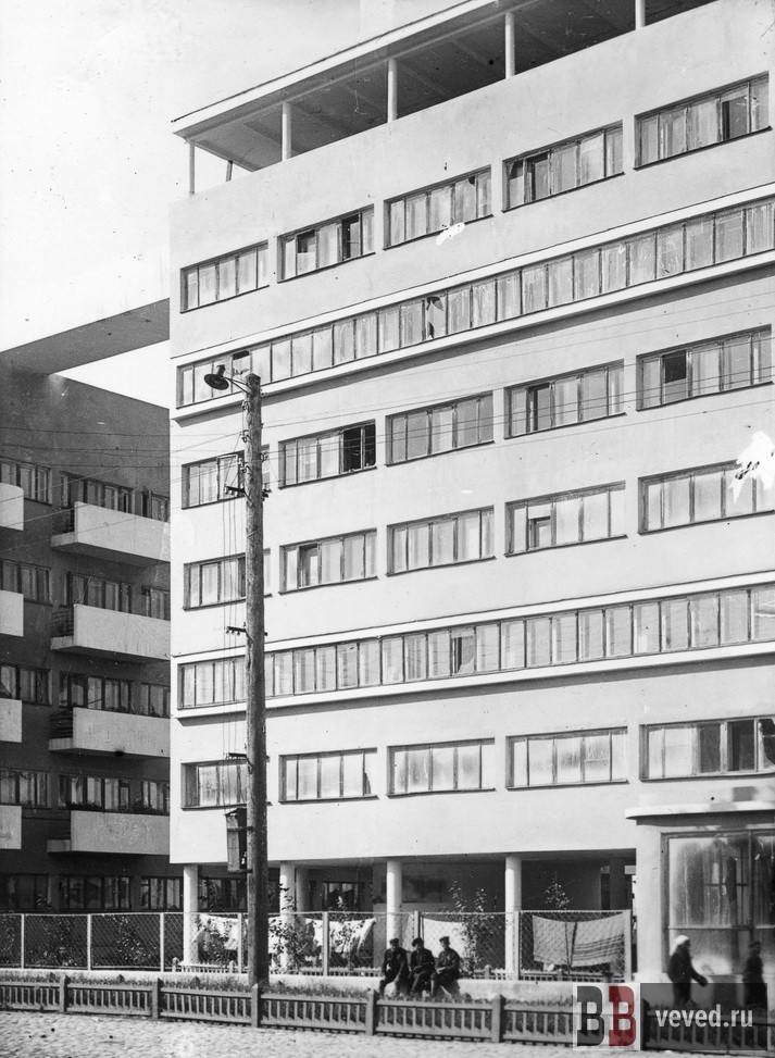 Восьмиэтажный корпус жилого комплекса до войны имел открытую террасу на верхнем этаже, а первый этаж частично стоял на колоннах